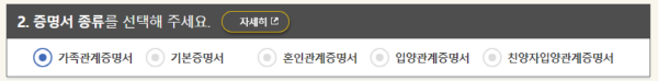 발급받고자 하는 증명서 종류 선택(가족관계증명서, 기본증명서, 혼인관계증명서, 입양관계증명서, 친양자입양관계증명서)