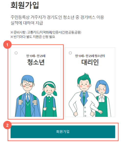 청소년이 지원금을 신청하려면 먼저 경기도 청소년 교통비 지원 포털에 접속해 회원가입을 해야 합니다.