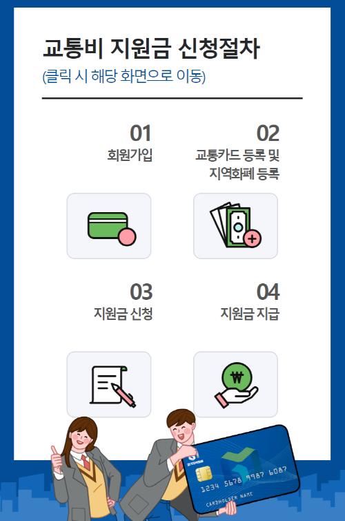 신청은 간단한 절차를 통해 진행되며, 신규 회원은 회원가입 후 교통카드 등록, 지역화폐 등록을 거쳐 신청할 수 있습니다.