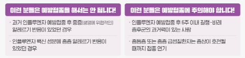 ▶ 과거 인플루엔자 백신 접종 후 중증(생명에 위협적인) 알레르기 반응이 있었던 경우나 인플루엔자 백신 성분에 중증 알레르기 반응이 있었던 경우 접종을 금기해야 합니다.