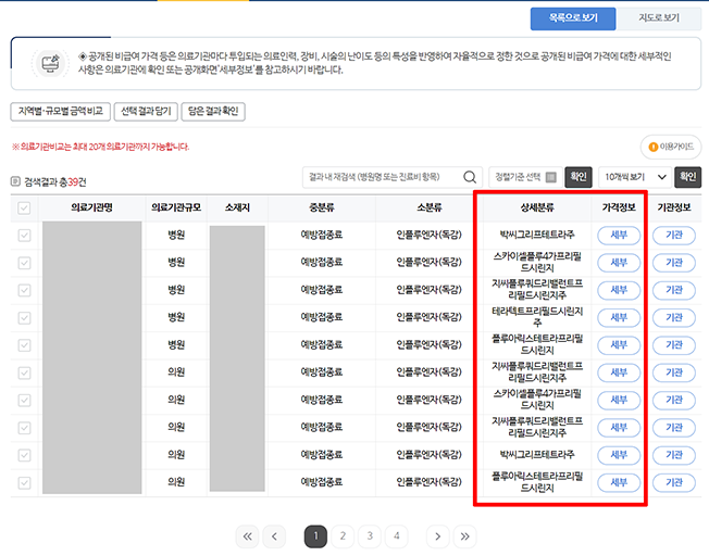 4) 그 지역의 병원별로 맞을 수 있는 백신명을 볼수 있고 가격정보의 '세부' 아이콘을 누르시면 가격을 알수 있습니다.