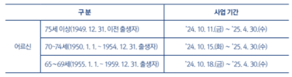➡️ 75세 이상 (1949.12.31 이전출생) : 2024.10.11.(금)~2025.4.30.(수)
