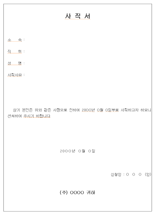 제목: 간단하게 '사직서' 또는 '사직의사표명서'로 작성합니다.